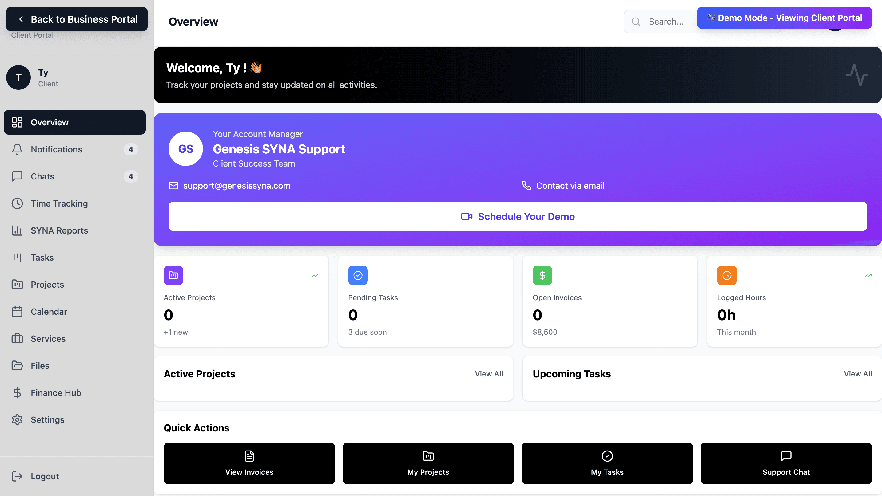 At the centre is Genesis SYNA — our AI-powered operations platform that connects your tools, automates workflows, and gives you real-time visibility across your business.
